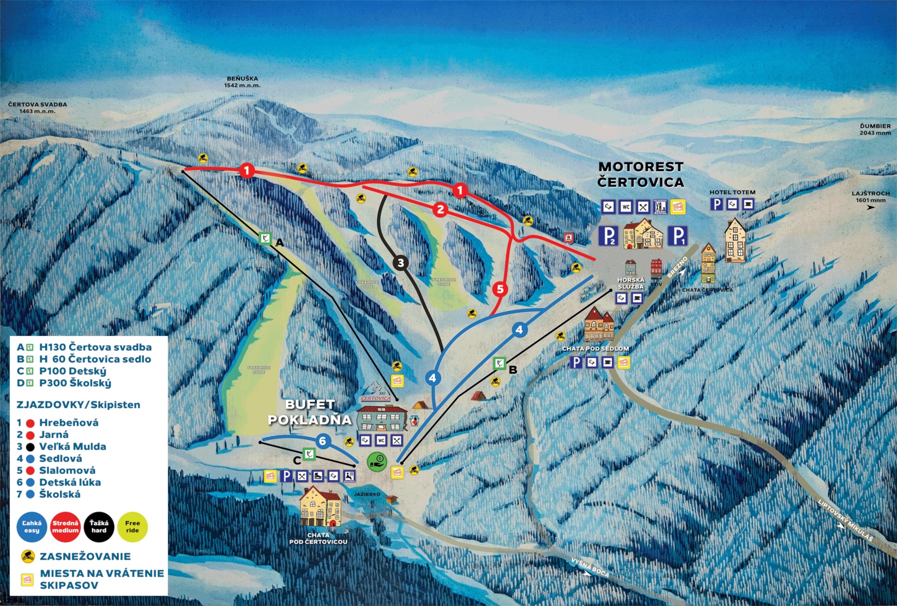 Ski Čertovica leží v srdci Nízkých Tater a nabízí lyžování v nadmořské výšce 1120–1460 m. Areál má kolem 5 km sjezdovek různých obtížností, od lehkých tratí pro začátečníky až po strmé svahy pro zkušené lyžaře. K dispozici je několik vleků, dětský svah, technické zasněžování a parkování přímo u střediska. Čertovica je známá krásnou horskou atmosférou a výbornými podmínkami pro lyžování i zimní turistiku.